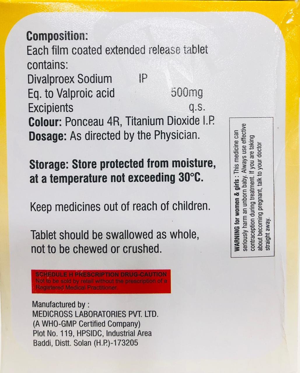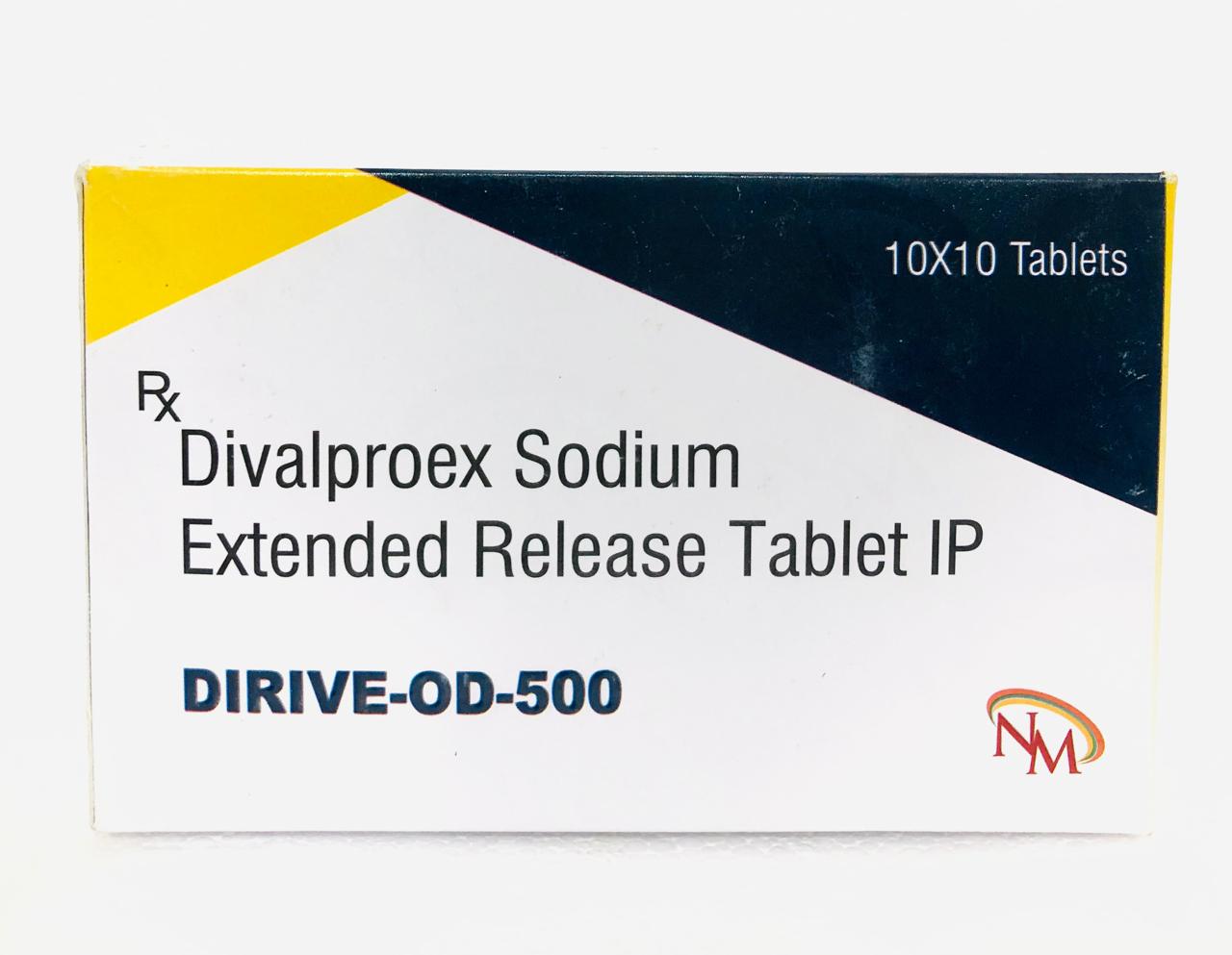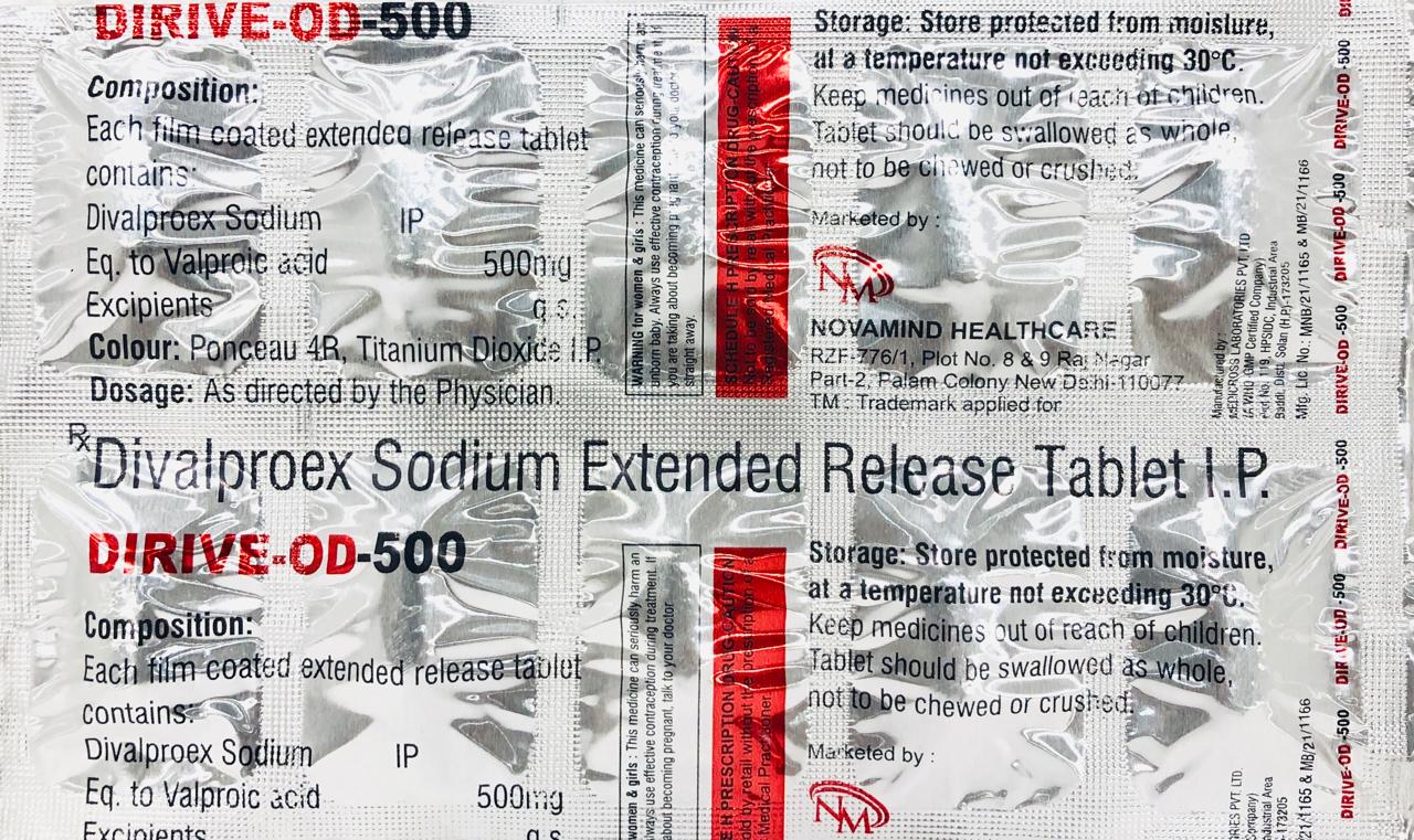 DIRIVE-OD-500 contains Divalproex Sodium 500 mg in an extended-release formulation. It is used in the treatment of epilepsy, bipolar disorder, and for the prevention of migraine headaches. The extended-release action helps maintain steady drug levels with convenient once-daily dosing.